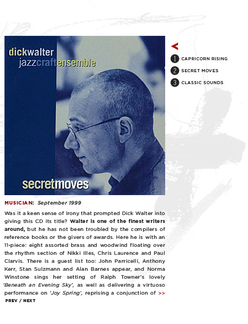 This CD served as my introduction to the talents of saxist-arranger-composer Dick Walter, and a very impressive introduction it proved to be. Each track is a Walter original, and they span a two-decade period, during which modern big band jazz has been at a premium, to say the least. As a jazz composer Dick Walter can stand alongside such worthies as Gerry Mulligan, Bill Russo, Francy Boland, Bob Florence and Bill Holman.